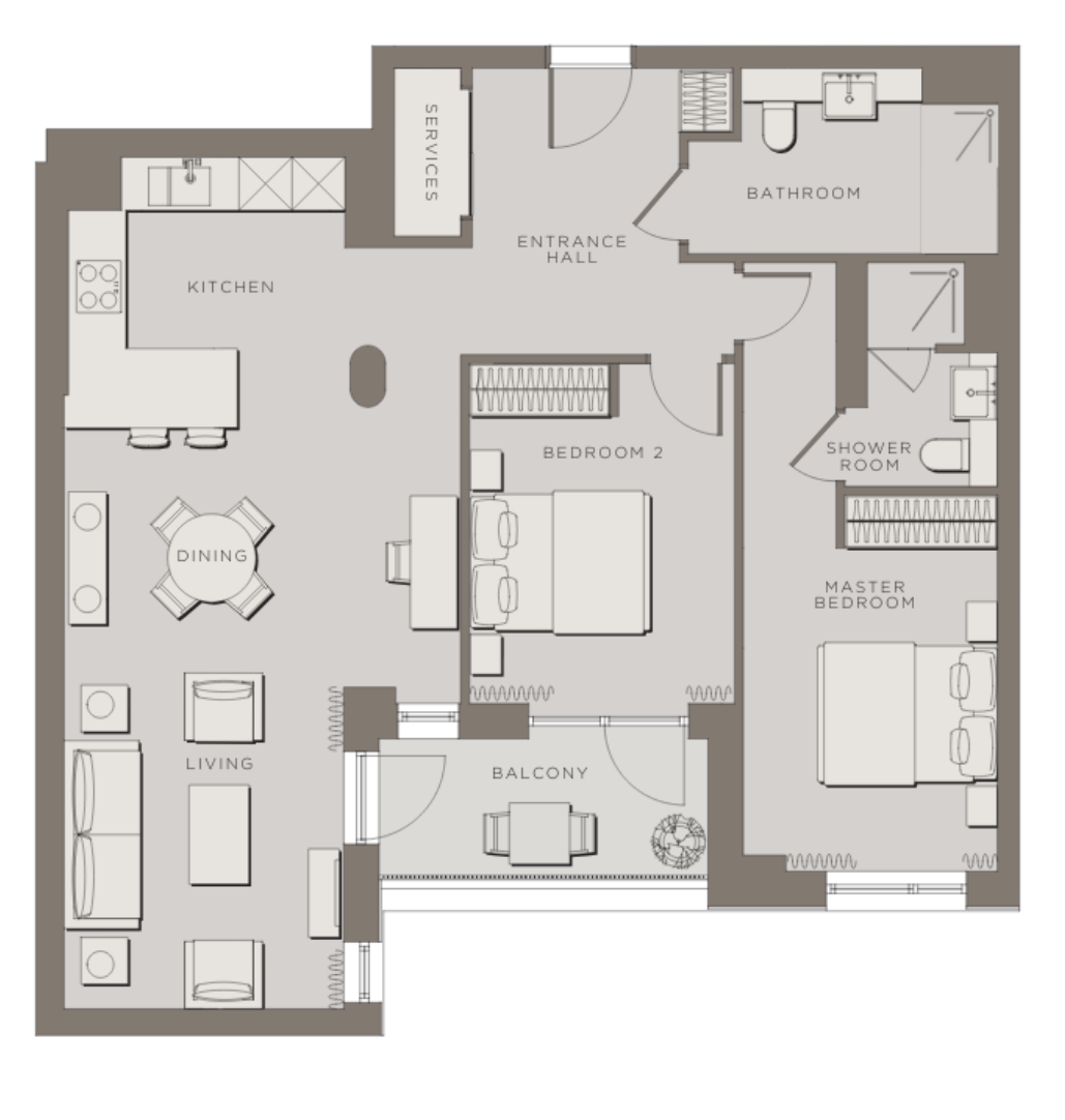 A generous residence with a spacious kitchen, living and dining room with a west facing private balcony accessed from the living room and the second bedroom.