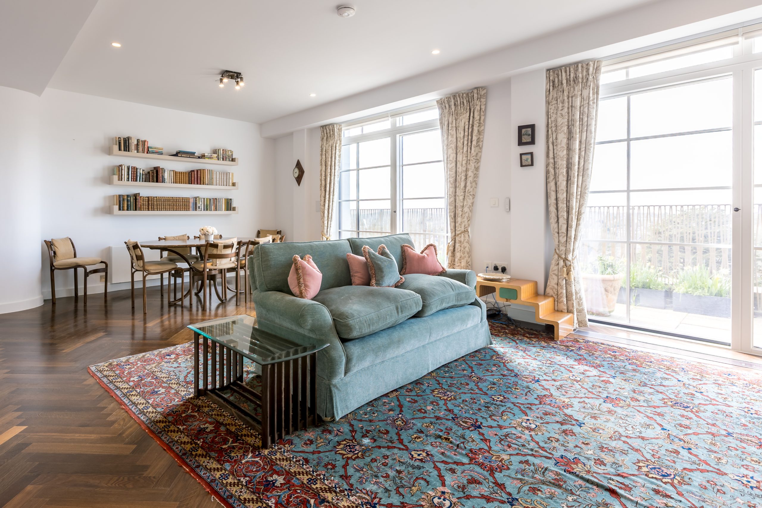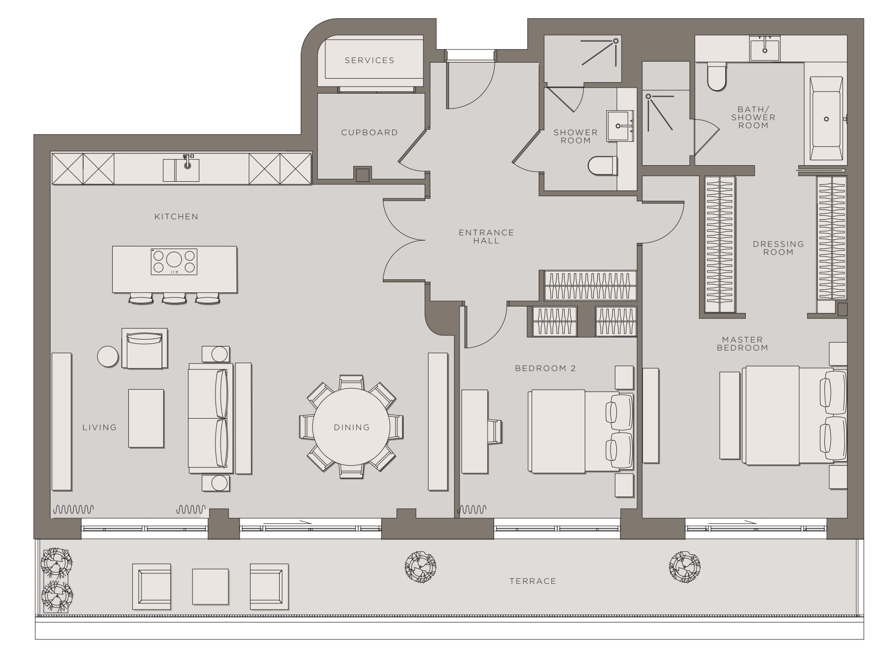 A spacious penthouse residence featuring a large open-plan kitchen, living and dining area with sliding doors opening onto an extensive west facing terrace providing excellent outdoor space and views. The property also offers an impressive master bedroom suite with dressing area and ensuite bathroom, along with a well-proportioned second bedroom and separate bathroom, creating a bright and comfortable home.