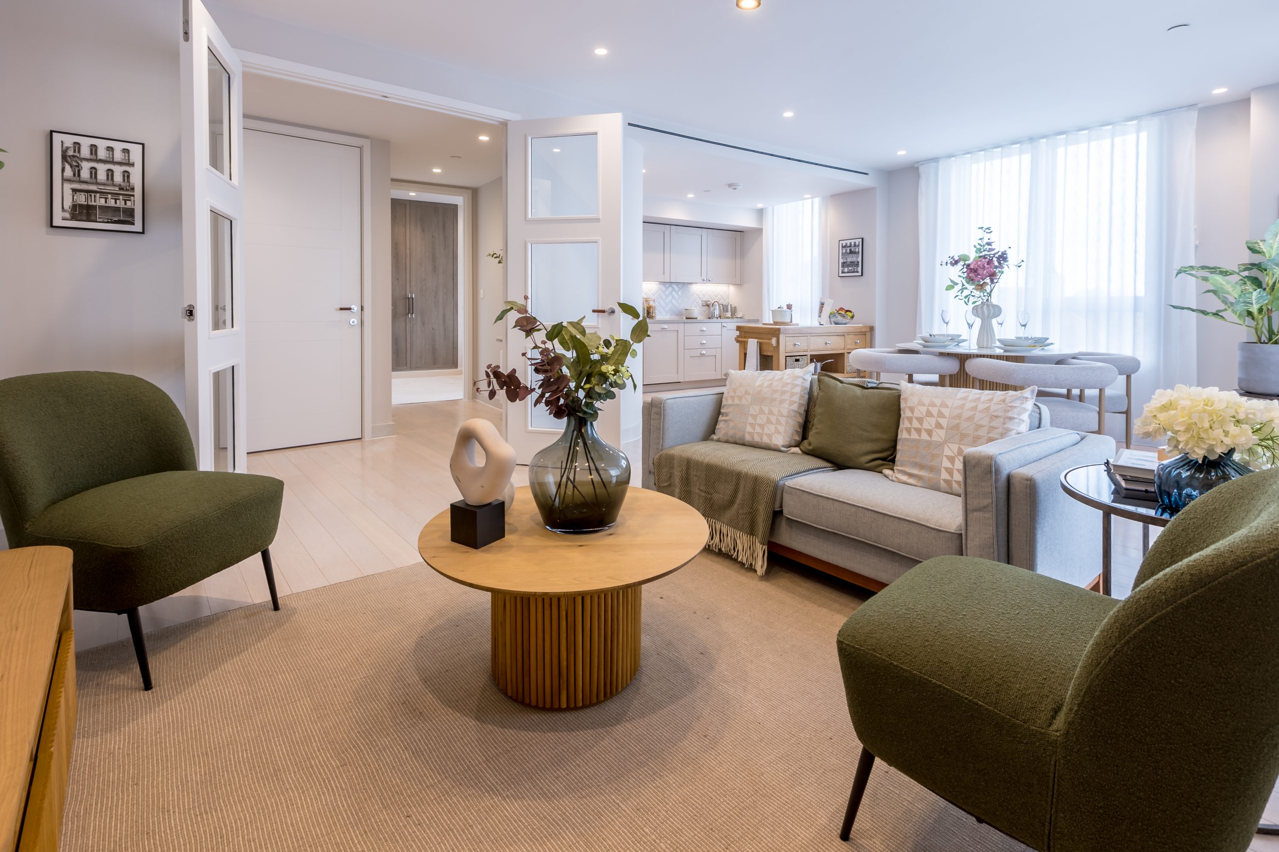 This elegant south-east-facing two-bedroom apartment is on the second floor.