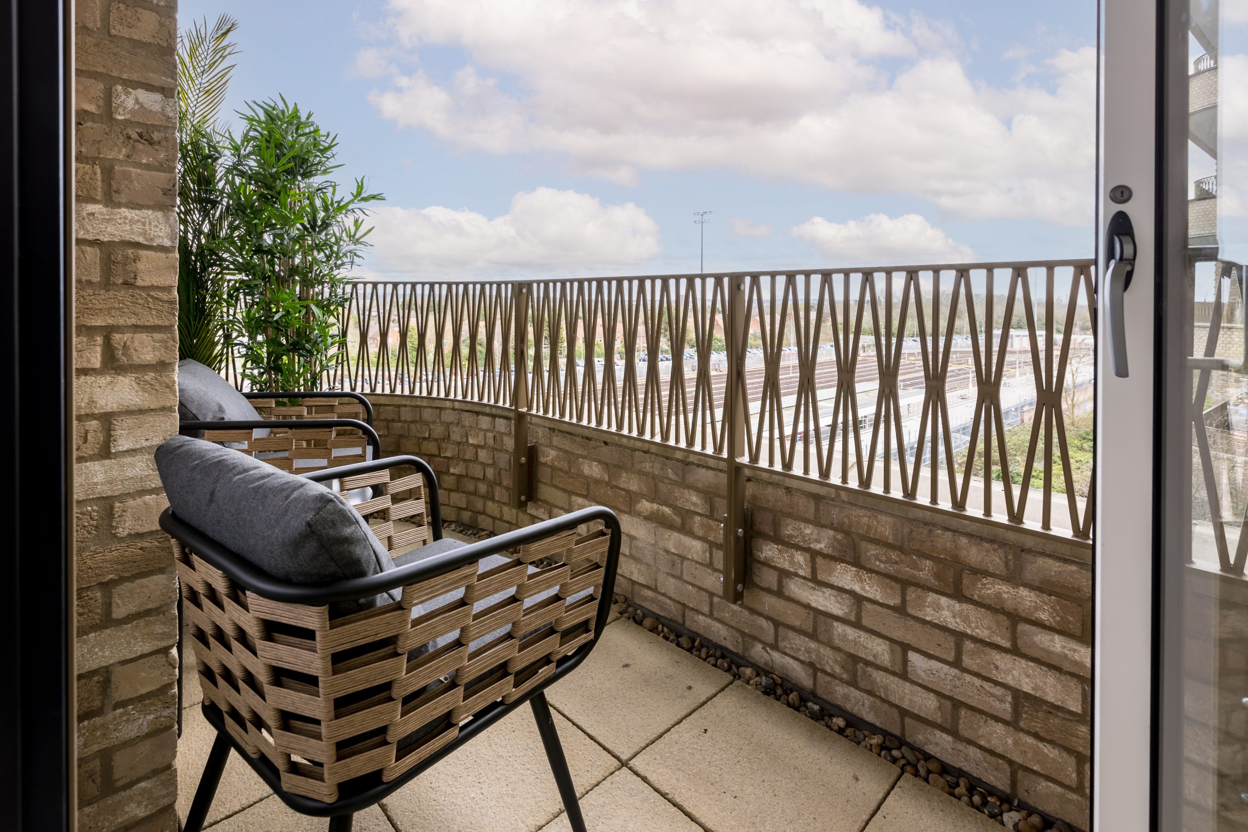 The open-plan living, dining and kitchen area is bright and spacious, with glass doors opening onto a south-facing balcony.