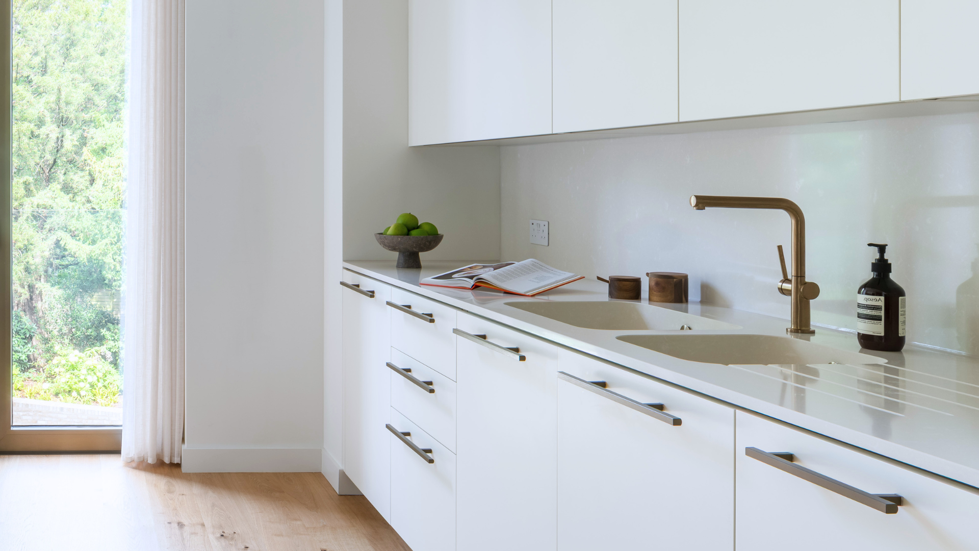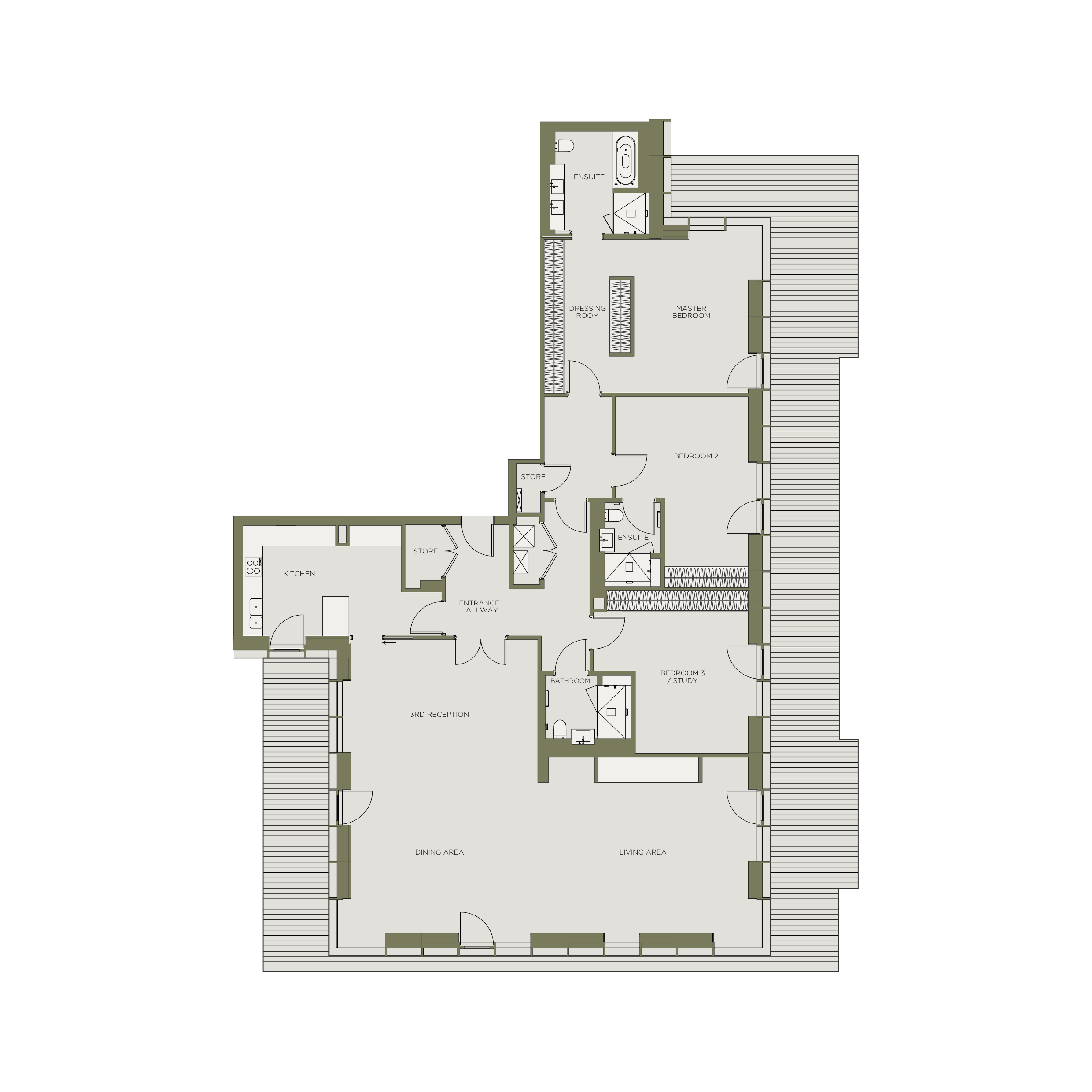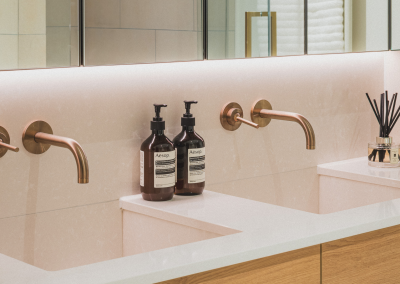 The primary bedroom benefits from a generous dressing area and an en-suite bathroom, complete with a fitted bath and a walk-in shower with a stone seat. The kitchen is finished with solid quartzite worktops and a full suite of integrated Miele appliances. Throughout the penthouse, solid wooden doors are fitted with brushed bronze ironmongery, while room-controlled air cooling and heating ensure year-round comfort. Engineered wood flooring extends across the living areas, with wool loop-pile carpeting in the bedrooms.