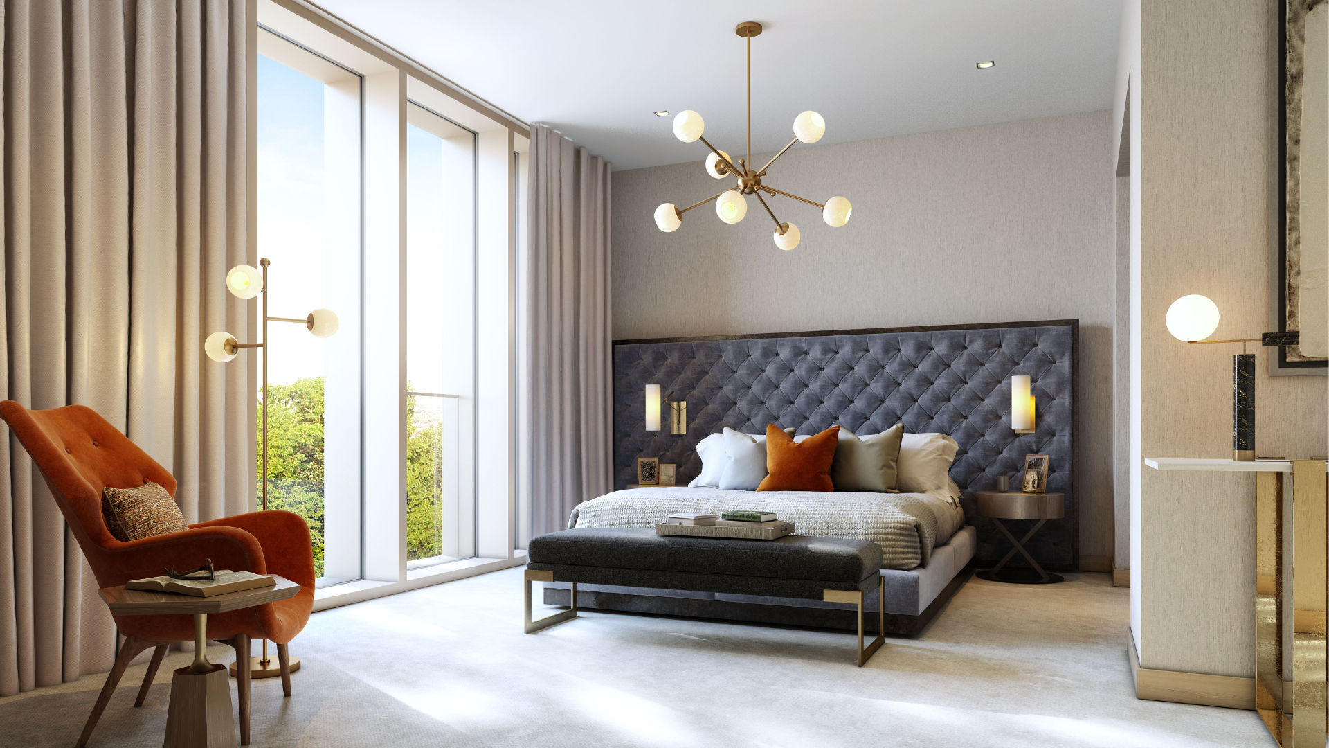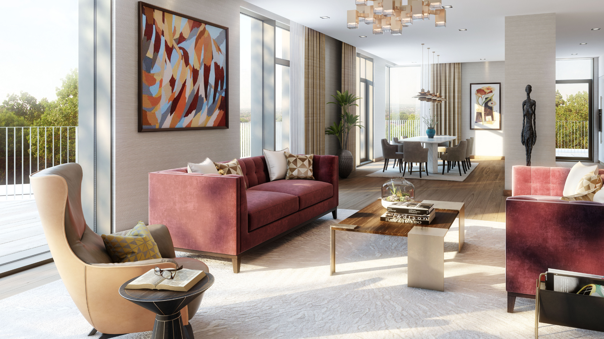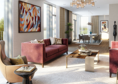 Set on the fifth floor, this stunning three-bedroom penthouse residence offers expansive living accommodation and a wrap-around terrace with 270-degree views across the landscaped grounds. The terrace, accessed via large glass doors from multiple rooms including the main living area and bedrooms, overlooks gardens designed by six-time Chelsea Gold Medal winners, Bradley-Hole Schoenaich Landscapes.