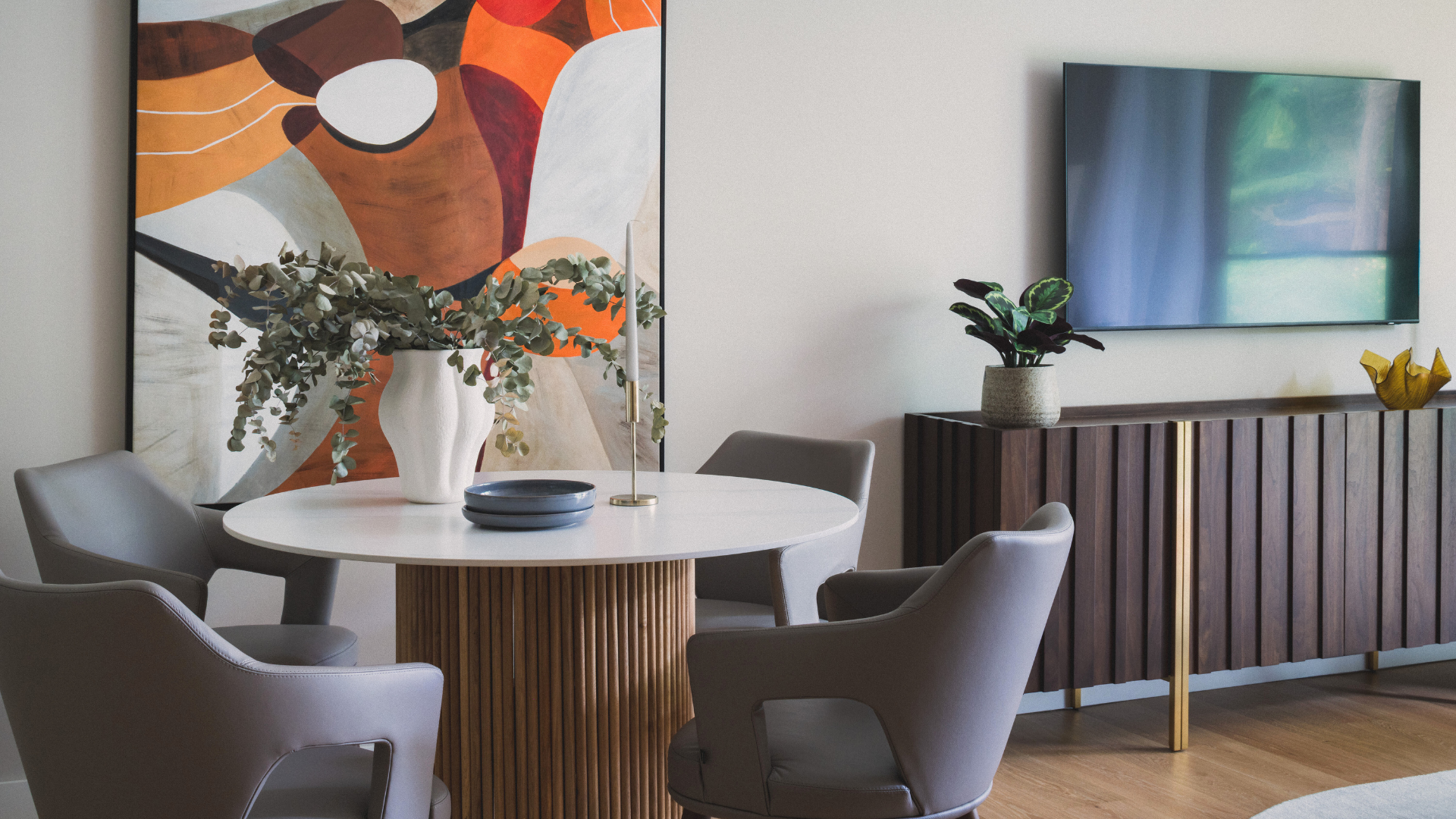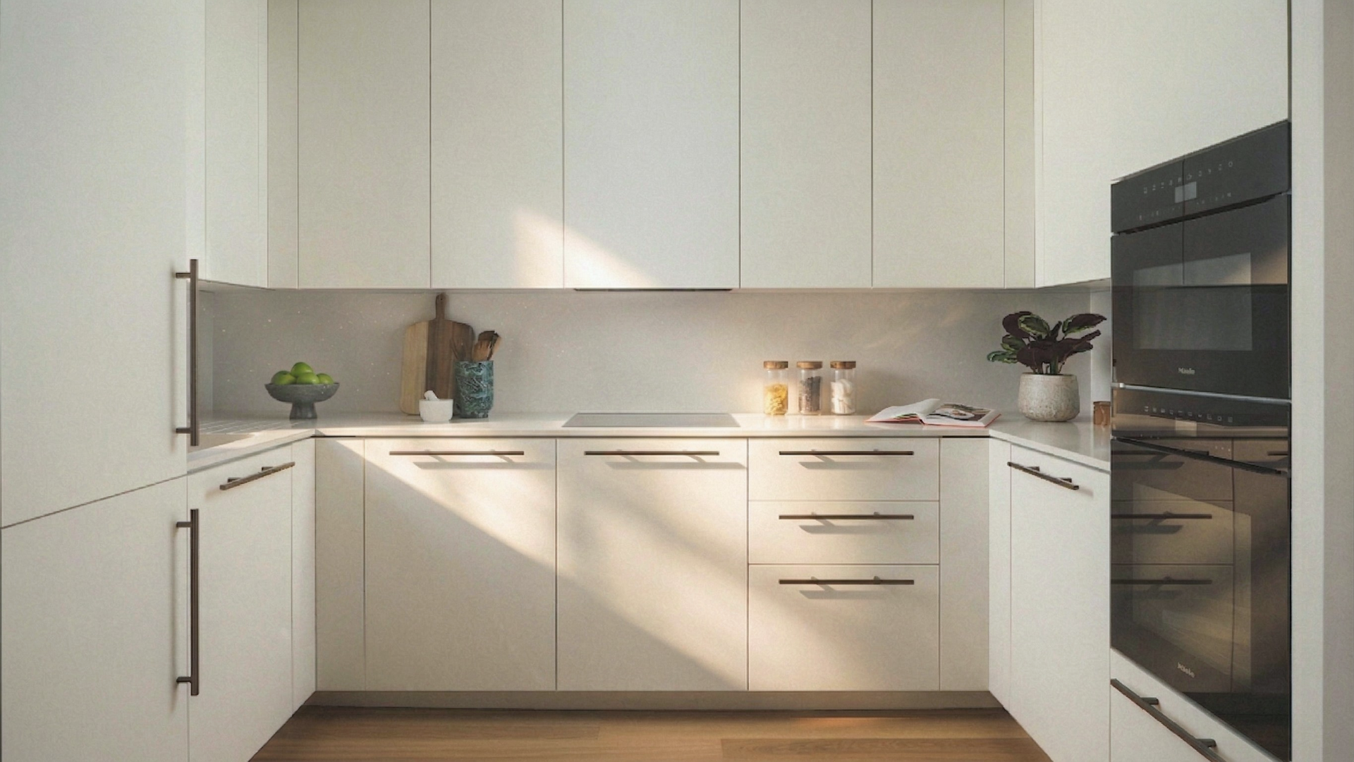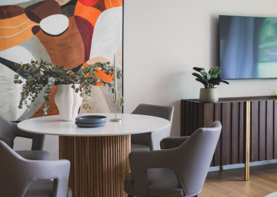 The primary bedroom benefits from a dedicated dressing area and an en suite bathroom with a walk-in shower, stone seat and brushed bronze accessories. The kitchen is finished with solid quartzite worktops and integrated Miele appliances. Throughout the residence, solid wooden doors are fitted with brushed bronze ironmongery, while comfort is maintained via room-controlled air cooling and heating. Engineered wood flooring runs through the living areas, with wool loop-pile carpeting in the bedrooms.
