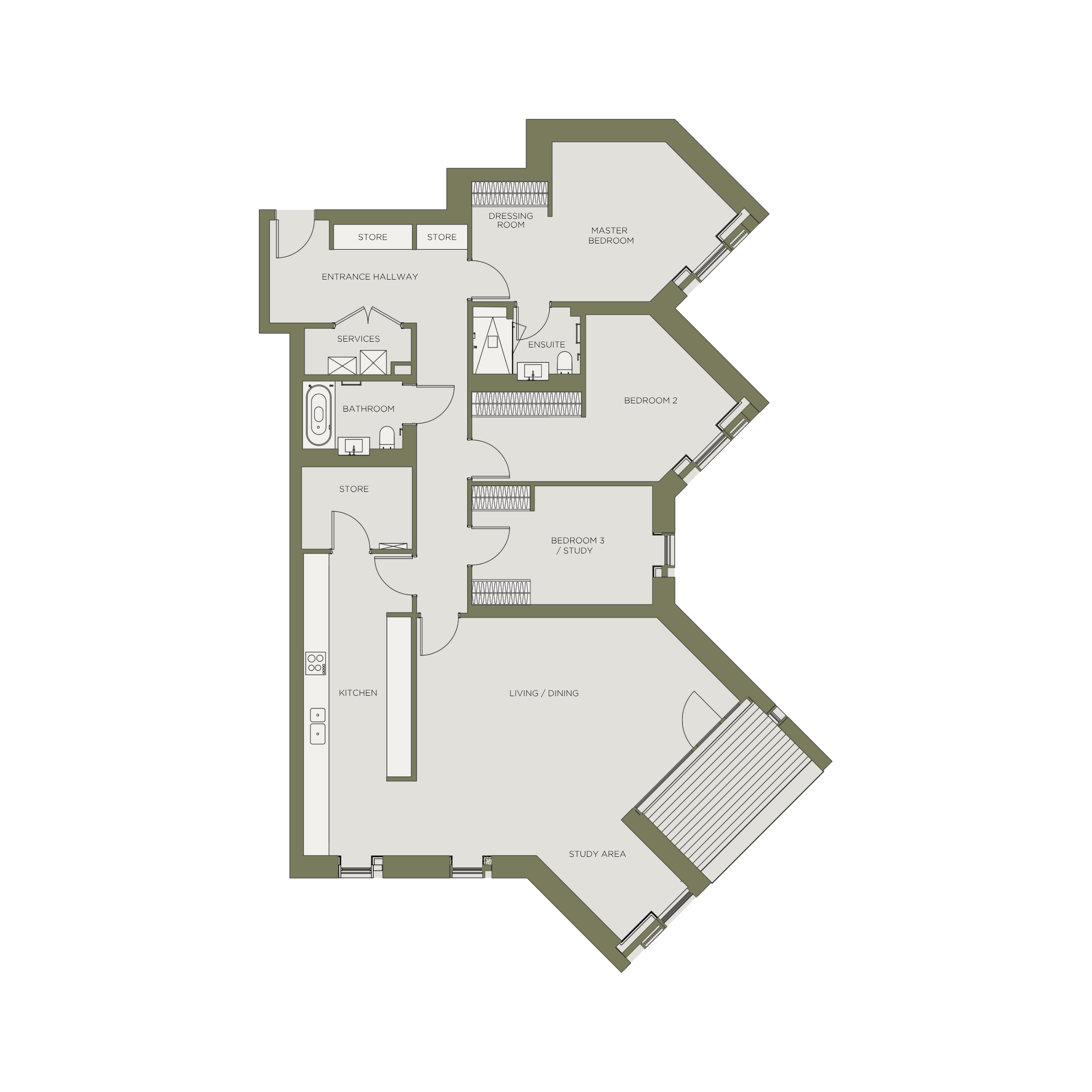 Set on the second floor, this three-bedroom apartment enjoys far-reaching views across ancient woodland. A generous living and dining room is complemented by a large separate kitchen, with the added benefit of a dedicated pantry.