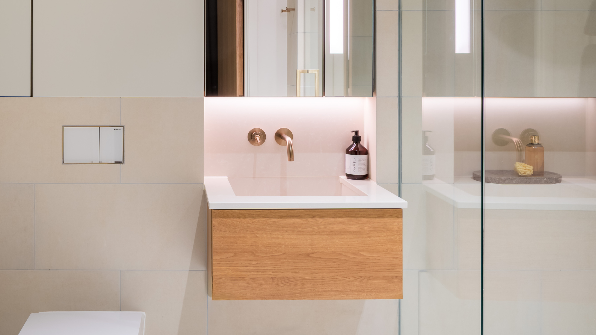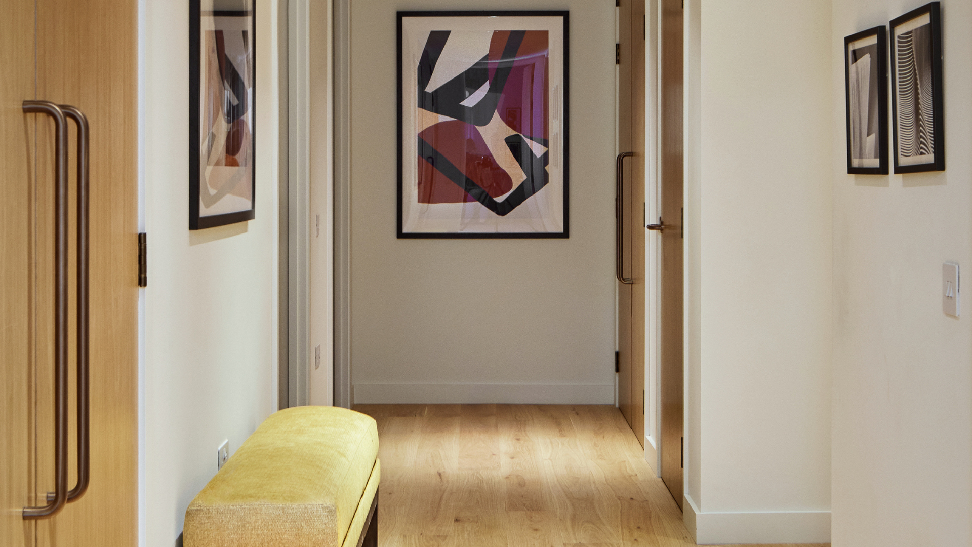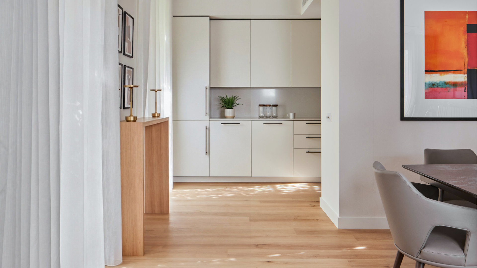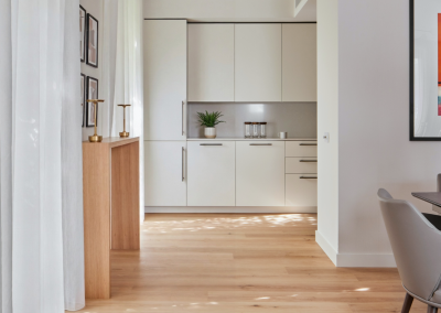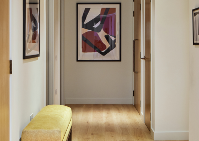 The kitchen features sleek quartzite worktops and discreetly integrated appliances, while the primary bedroom benefits from an ensuite bathroom, complete with a walk-in shower and stone seat. Engineered wood flooring runs throughout the living areas, with wool loop-pile carpeting in the bedrooms.