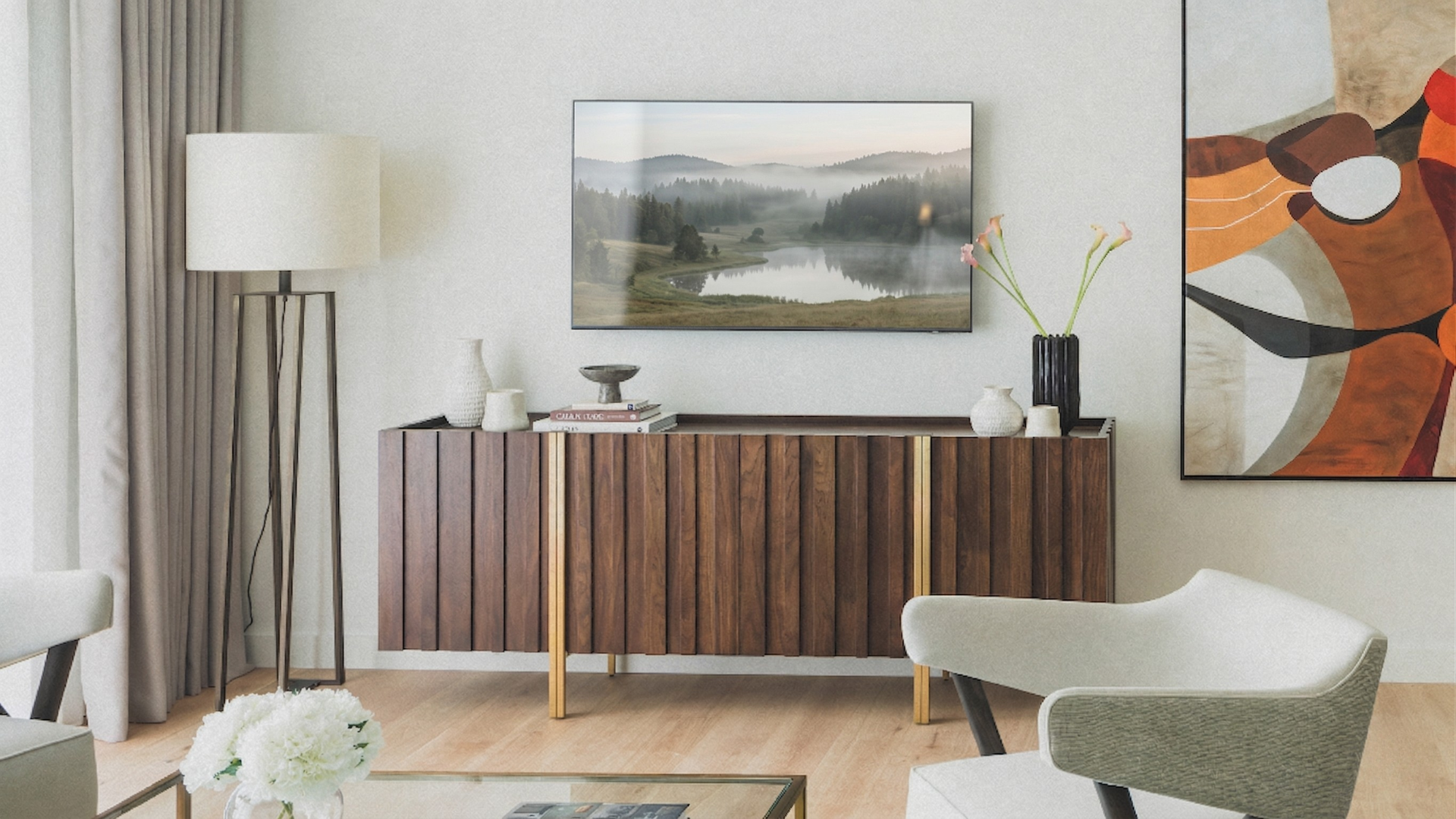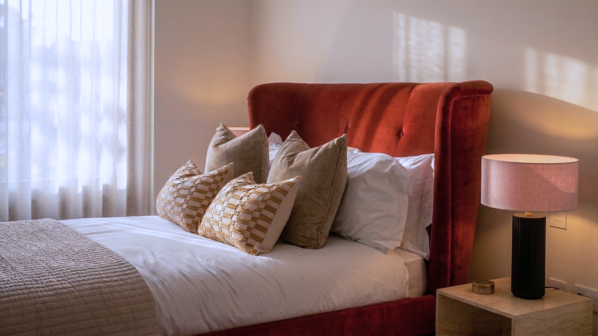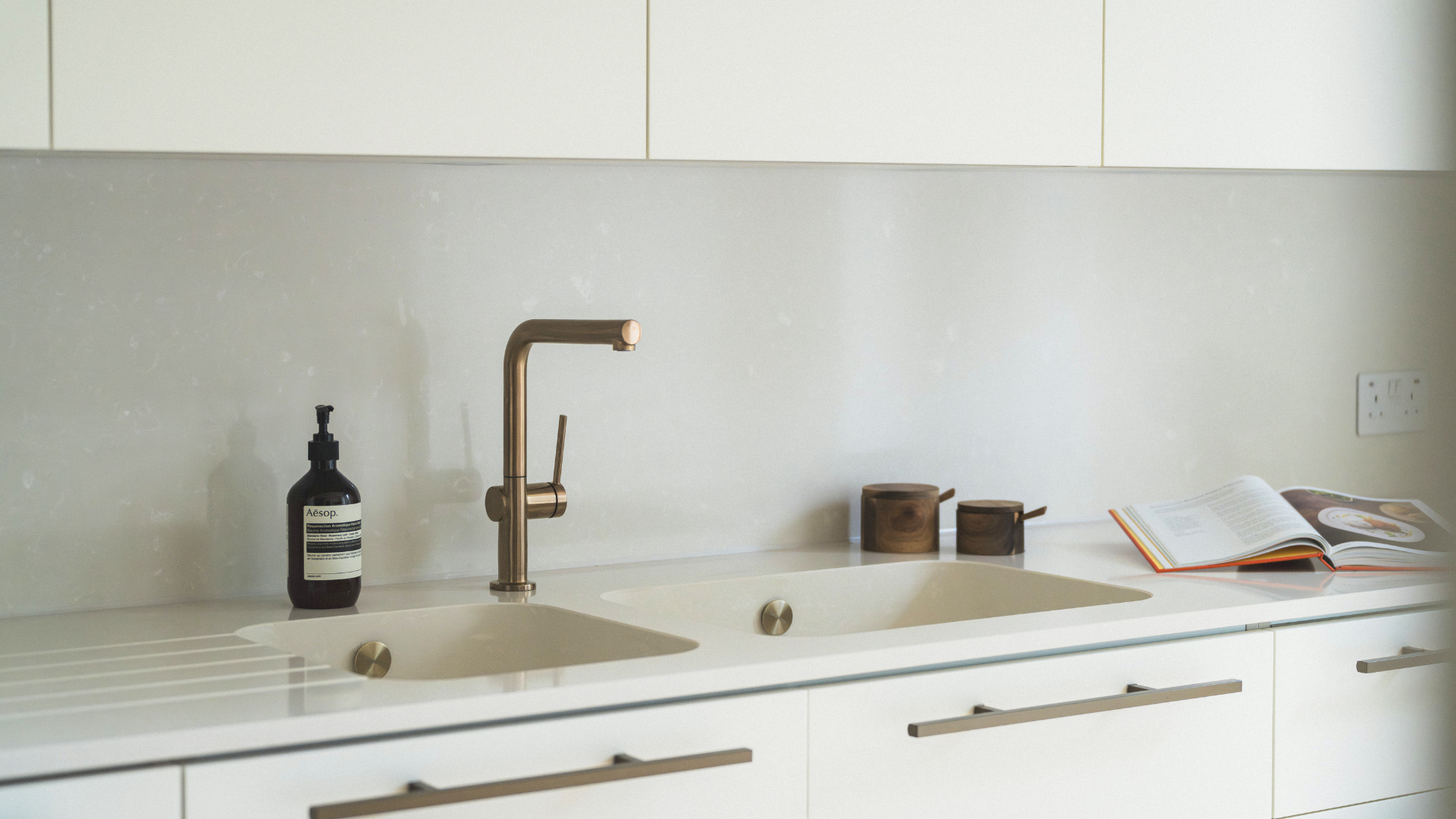 The kitchen features sleek quartzite worktops and discreetly integrated appliances, while the primary bedroom benefits from an ensuite bathroom, complete with a walk-in shower and stone seat. Engineered wood flooring runs throughout the living areas, with wool loop-pile carpeting in the bedrooms.